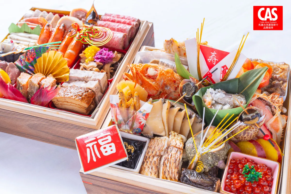 高品質なおせち料理を保つため、特殊冷凍マシン「CAS」を用いており、家庭の冷蔵庫で保存・解凍するだけで、ふっくらとした状態が復元されます。