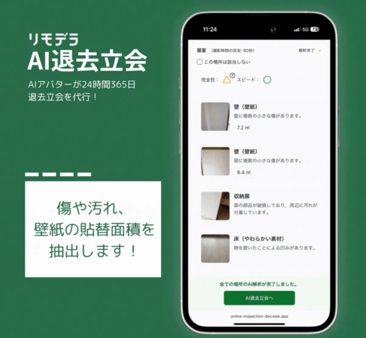 利用者がAI退去立会を使用する際は、まずスマートフォンを使って部屋全体を撮影します。その後、AIが自動的に傷や汚れを検出し、結果をAIアバターと対話する形で報告します。このプロセスは非常にスムーズで、賃借人は手間なく報告を行うことができます。