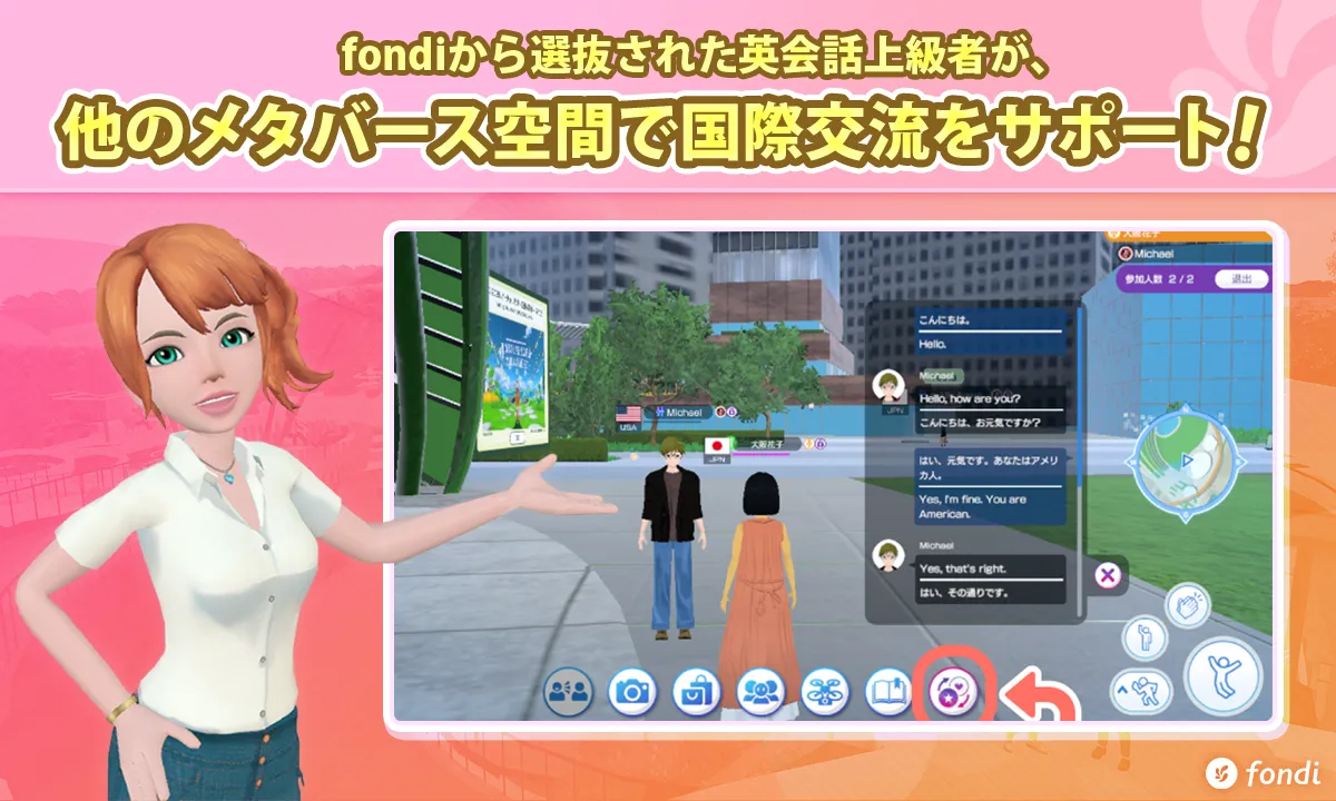 『fondi』では、世界中で200万人以上のユーザーがいる中から特に優れた英会話パートナー「Buddy」を選定し、彼らを「VIRTUAL GRAND GREEN OSAKA」の空間へと派遣します。「Buddy」は英会話の実践をサポートするプロフェッショナルであり、ノンネイティブの上級者としての役割を果たしています。参加者は、AI通訳の利用法を学びながら、Buddyとともに多言語・多文化の交流を楽しむ機会を得ることができます。