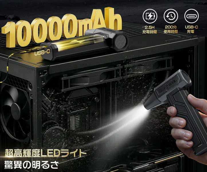 Ciniffoエアダスターは、使いやすさにもこだわっています。4段階の風量調整が可能で、用途に応じたワンタッチ切り替えが便利です。また、6種類のノズルとブラシが付属しているため、細かい作業から大きな範囲まで様々なシーンに対応します。これにより、PC内部やサッシ、家具の隙間など、奥まった場所も明るく照らしてしっかり掃除することができます。