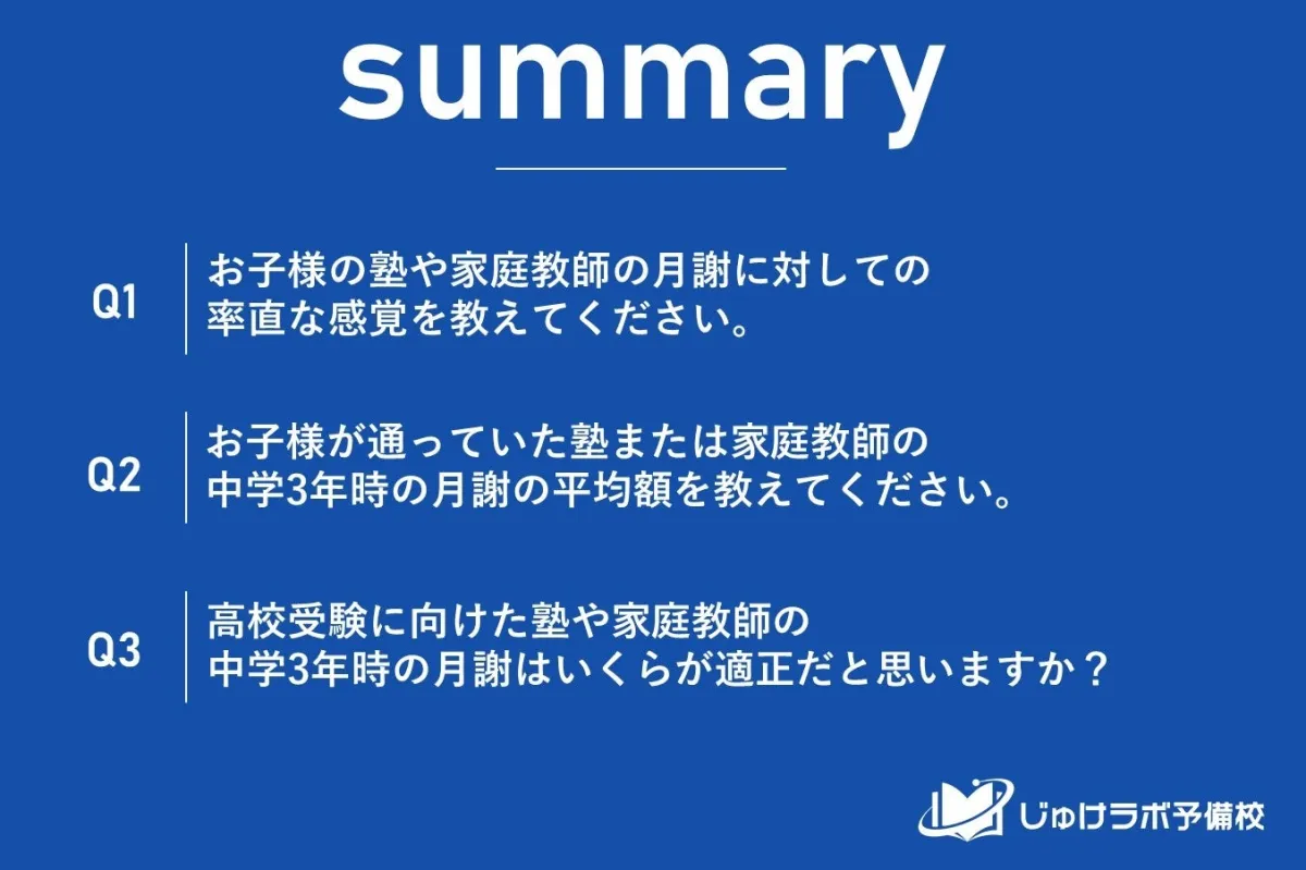 じゅけラボ予備校では、2025年7月から9月にかけて、高校受験対策として塾または家庭教師を利用した375名の40歳から59歳の保護者を対象に調査を実施しました。本調査は、インターネットを通じて行われ、実際に支払った月謝と妥当だと考える金額についての意見が収集されました。