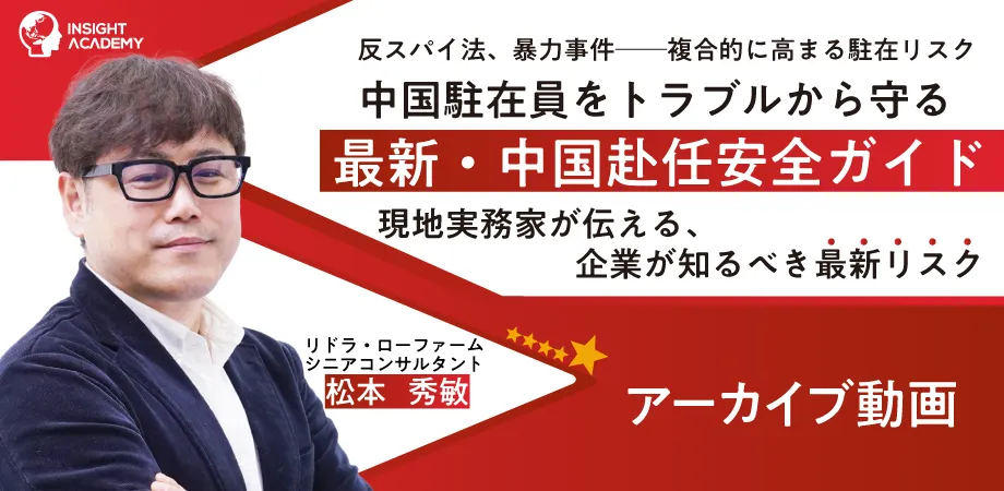 中国におけるビジネスは、ますます複雑化しています。企業は、駐在員と帯同家族が安全に生活・働くための具体的な行動を整備する必要があります。インサイトアカデミーの提供するセミナーは、そうした準備の一助となることでしょう。参加申し込みはお早めに行い、貴重な情報を手に入れましょう。