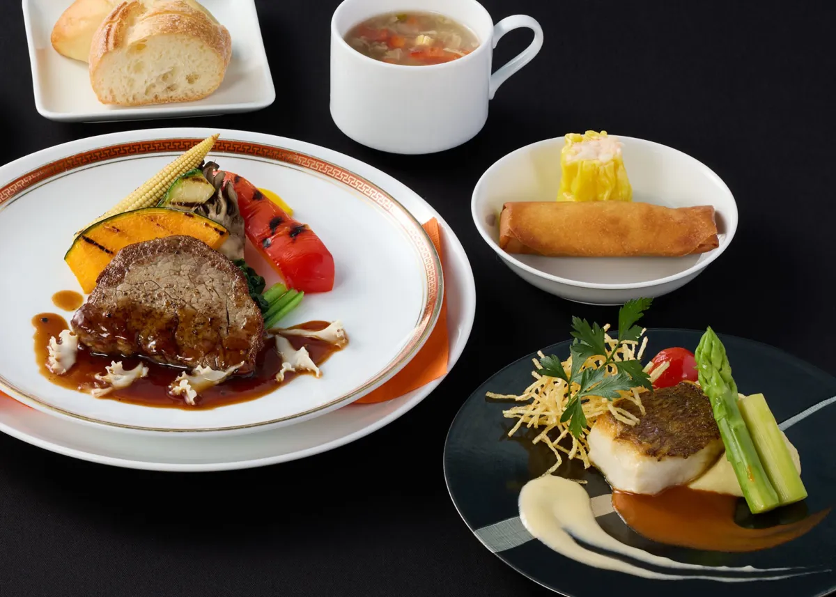 - - プレミアムセット: 前菜3種、2種類の点心、魚料理と肉料理が楽しめて、6,000円。