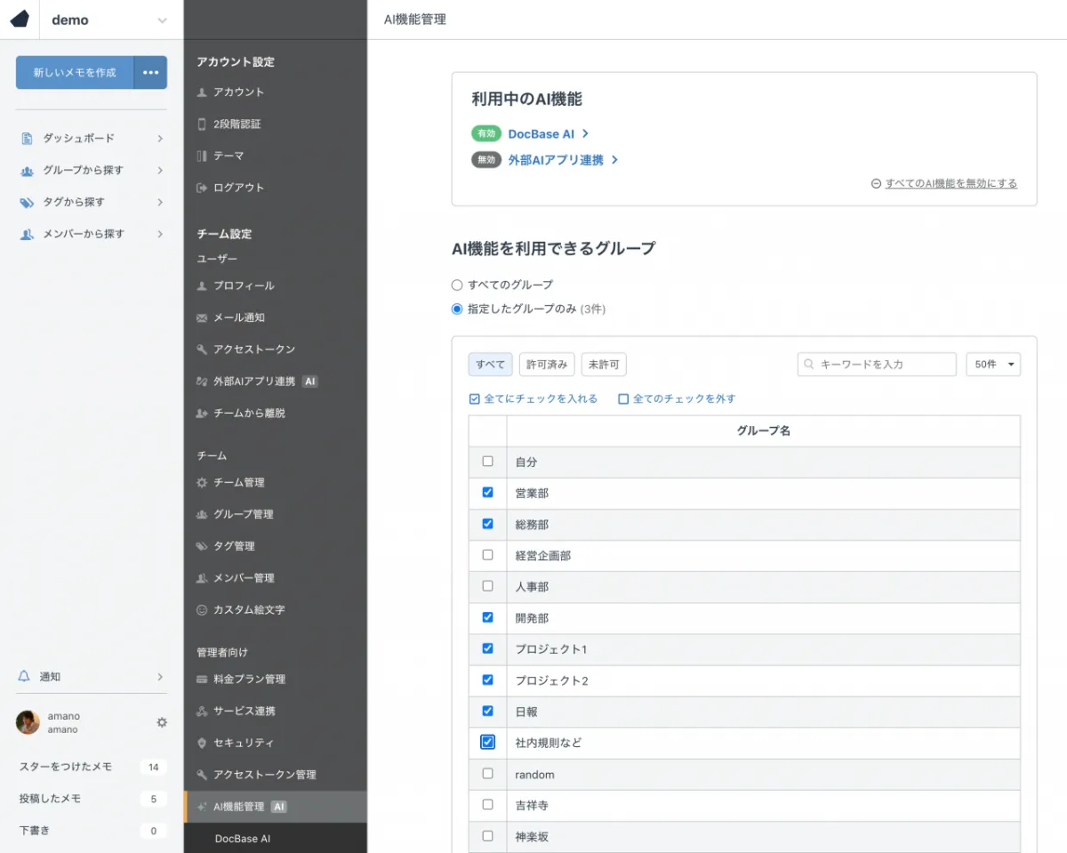 企業の現状では、AIによる業務効率化が求められる一方で、重要な機密情報や個人情報をAIに送信することに対する懸念が高まっています。その対処法として、DocBaseの新機能は、グループ単位でAIに送信するデータを制御することを可能にしました。これにより、チーム管理者は機密情報を扱うグループをAI利用対象外に設定し、安全にAI機能を活用できる環境を構築できます。