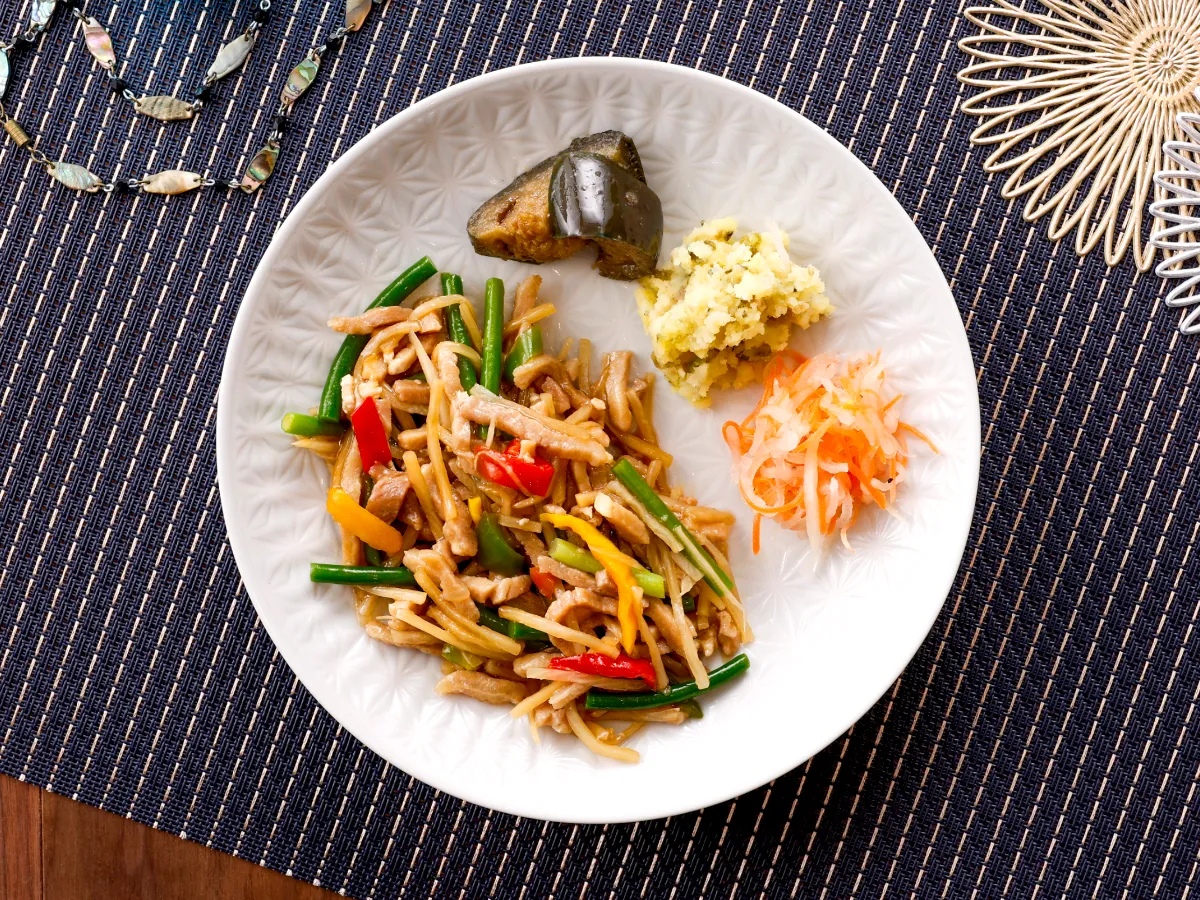 「筍たっぷりチンジャオロース」は、1個224kcalと比較的低カロリーでありながら、たんぱく質を17.8g含む高タンパクなメニューです。糖質も14.7gと健康を意識した方に嬉しい内容。副菜には、高菜入りのポテトサラダ、あっさりとした大根の塩だれ、揚げることでコクがアップしたなすの生姜醤油が添えられており、食感や大きさの異なるメニューで食事の多様性も楽しめます。