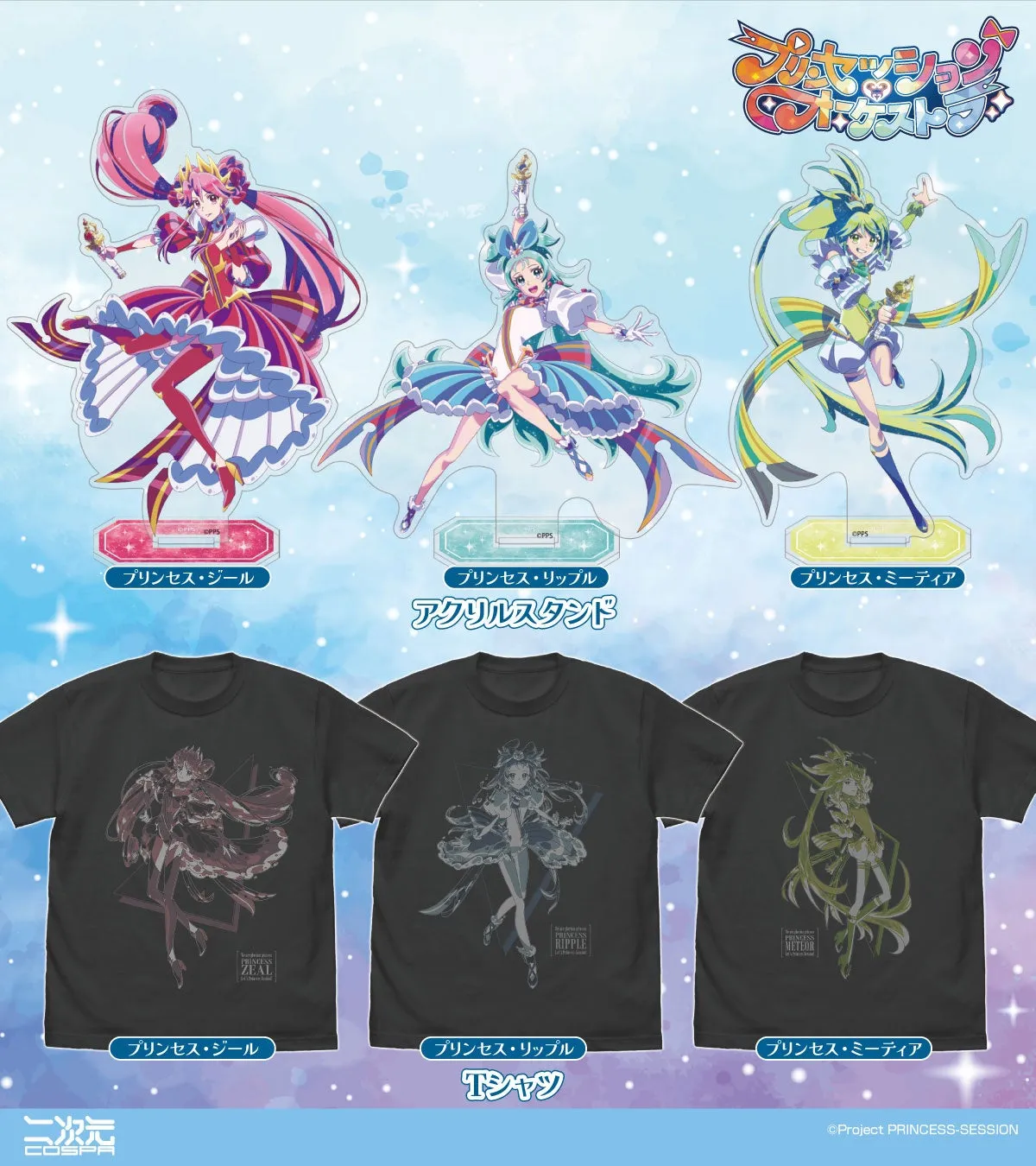 オリジナルTVアニメ「プリンセッション・オーケストラ」に登場する魅力的なキャラクターたちをテーマにした新グッズが、株式会社コスパの「二次元コスパ」より発表されました。特に注目なのは、プリンセス・リップル、プリンセス・ジール、プリンセス・ミーティアの三人をフィーチャーしたアクリルスタンド、Tシャツ、パスケースなど多彩なアイテムです。