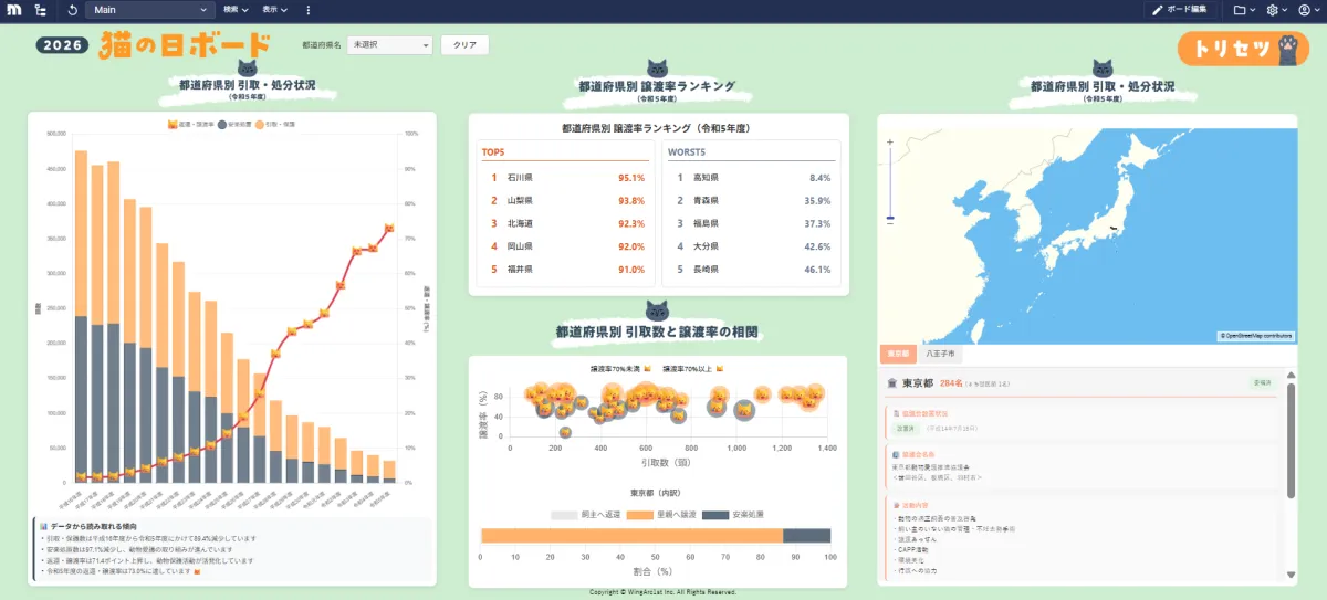 毎年2月22日は「猫の日」として全国的に知られていますが、今年は特に注目を集めているのがウイングアーク1st株式会社が発表した「猫の日ボード」です。このボードは、環境省の保護猫活動データを元に、各地域の猫の譲渡率や引取り状況を直感的に理解できる形に可視化されています。