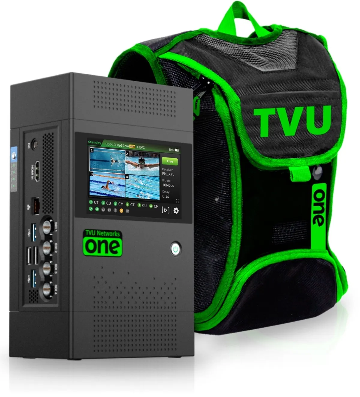 TVU Oneは、複数のモバイル回線(5G/4G LTE/Wi-Fi)を束ねて高品質な映像伝送を実現するマルチSIM対応の映像伝送トランスミッターです。この機器には以下のような特長があります: