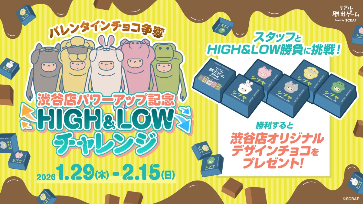 新作イベントのスタートを記念し、2026年1月29日〜2月15日の期間中、特別なキャンペーン『渋谷店パワーアップ記念HIGH&LOWチャレンジ』が行われます。参加者は店内でのイベントに参加することで、「参加券」を手に入れ、その後チャレンジブースでスタッフと対戦できます。勝利すると、SCRAPのオリジナルキャラクターSCRAPPIESがデザインされたチョコを1つプレゼントされます。果たして、あなたはこのスリリングな挑戦に勝てるでしょうか?