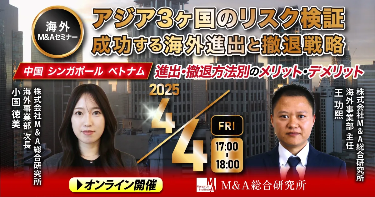 日本国内の中小企業の多くが海外進出を目指していますが、その道のりには様々なリスクが伴います。近年、人件費の上昇や政治的な不安定さから、海外で製造や投資を行っている企業が国内回帰を考えるケースも増えています。そこで、M&A総合研究所が主催する『海外M&Aセミナー』が、2025年4月4日(金)にオンラインで行われることになりました。このセミナーでは、中国、シンガポール、ベトナムの3カ国に焦点を当て、それぞれの国における進出や撤退のベストタイミングを見極める方法を解説します。