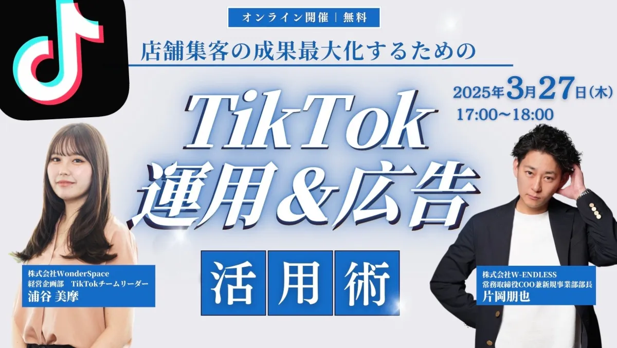 株式会社WonderSpaceと株式会社W-ENDLESSは、2025年3月27日(木)に共催で「店舗集客の成果最大化するためのTikTok運用とTikTok広告の活用術」というウェビナーを開催します。この無料イベントは、多くの企業が抱える集客課題を解決するための具体的な戦略を柔らかく学べる機会です。