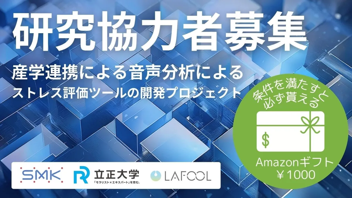 また、本研究に協力していただけるモニターを募集します。現在就業中の方であれば、就業形態を問わず参加可能です。スマートフォンでアンケートに答え、簡単な音声録音を行うだけで、所要時間は約10分程度。参加者には謝礼として1,000円分のAmazonギフト券が進呈されます。