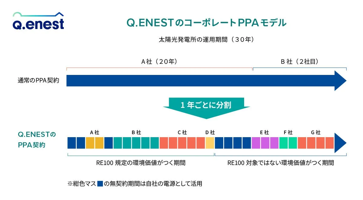 2023年、Q.ENESTホールディングス株式会社は、再生可能エネルギーの新たな購入モデルである短期コーポレートPPA(Power Purchase Agreement)を提供開始しました。これにより、企業は1年ごとに契約を更新しながら、太陽光発電などの再エネを手軽に導入できるようになります。