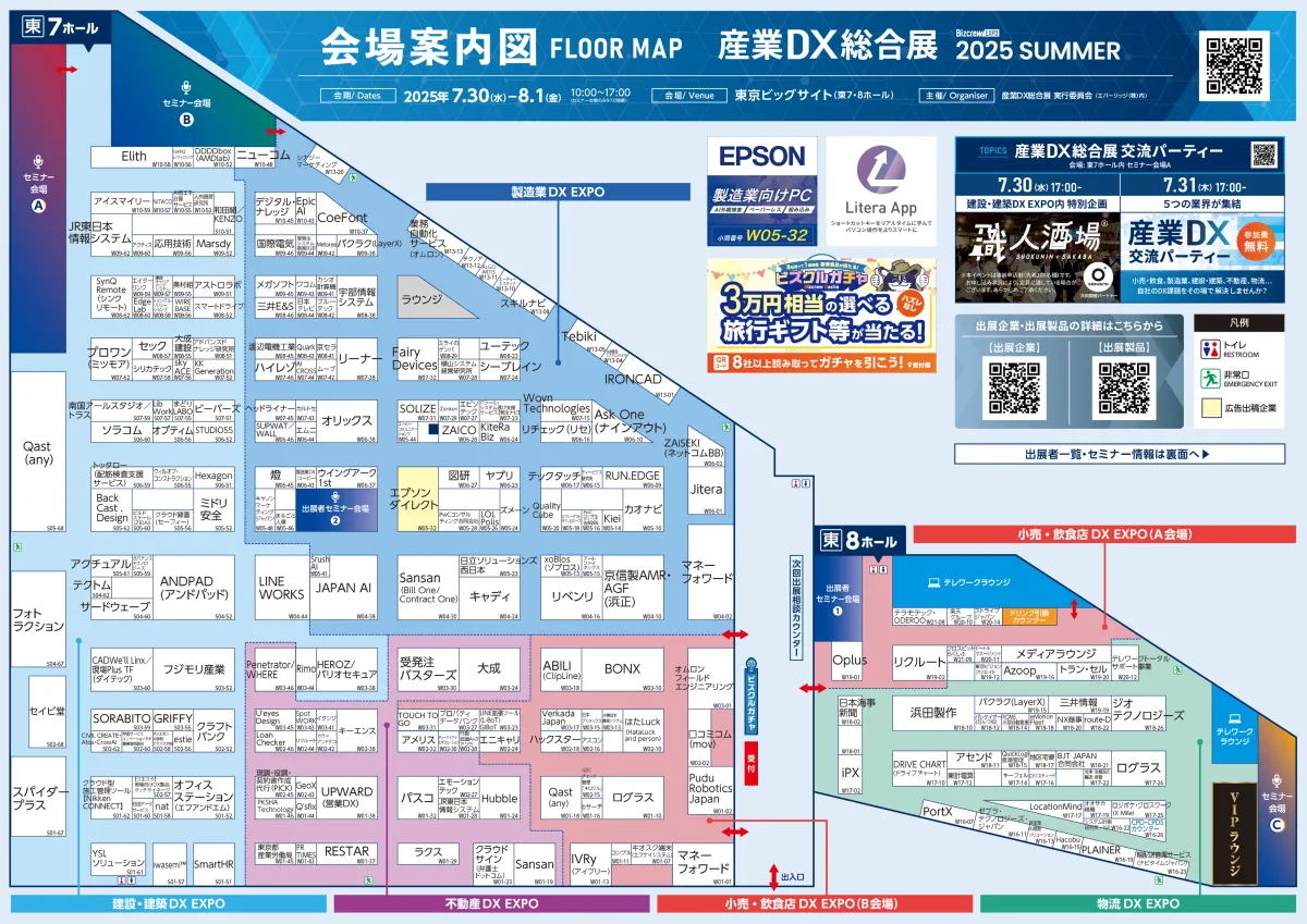 産業DX総合展の会場案内図はすでに公開されており、訪問者は事前にダウンロードして利用することができます。これは、会場内でのスムーズな移動や、興味のあるブースを効率良く訪問するために非常に役立ちます。
