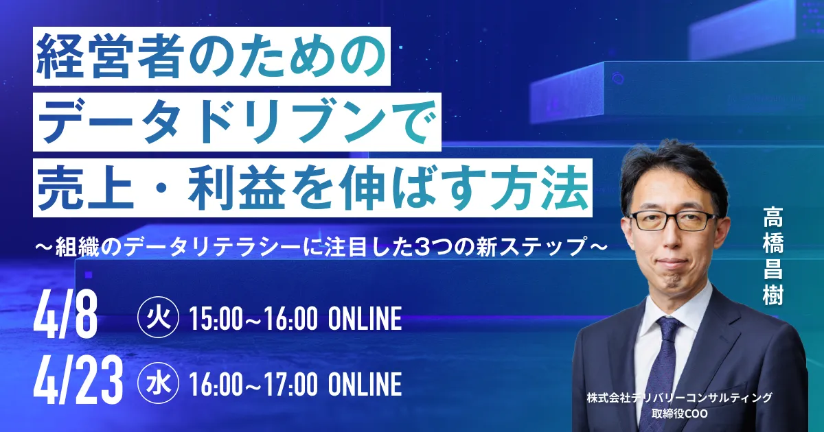 データを駆使してビジネスの成長を促す「データドリブン経営」は、現代の企業にとって必要不可欠な戦略となっています。そんな中、株式会社デリバリーコンサルティングは、経営者向けに特化したWEBセミナーを開催することが決定しました。このセミナーでは「データリテラシーの向上」をテーマに、企業がどのようにデータを活用して売上や利益を伸ばせるかを探求していきます。