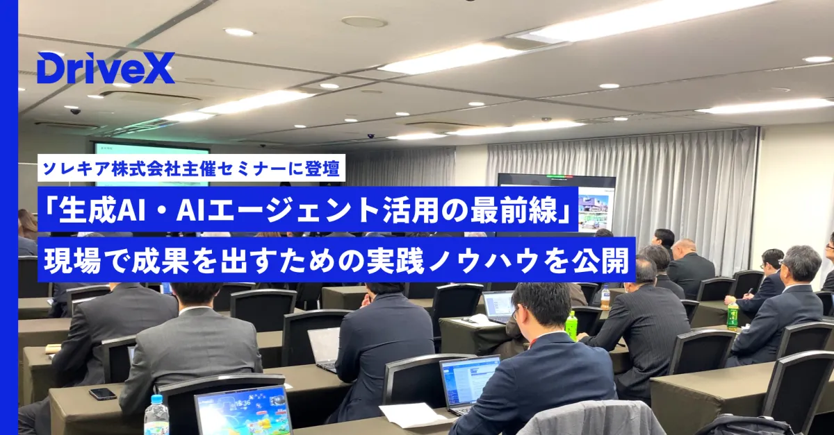 2026年2月25日、株式会社DriveXの代表取締役、永田篤広氏とCTOの楠亀晃星氏が、ソレキア株式会社主催のセミナー「AI導入の壁をどう突破するか?」に登壇しました。本セミナーでは、生成AIとAIエージェントの実践的な活用法について具体的なノウハウが披露され、参加者の関心を集めました。
