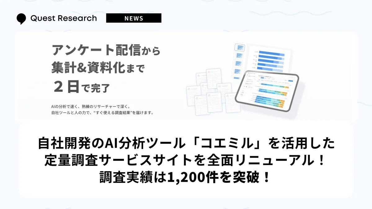 株式会社Quest Research(東京都渋谷区、代表取締役:南 健太)は、定量アンケート調査サービスのウェブサイトを全面的にリニューアルしました。さらに、同社のサービスによる累計調査実績が1,200件を突破したことも発表しています。