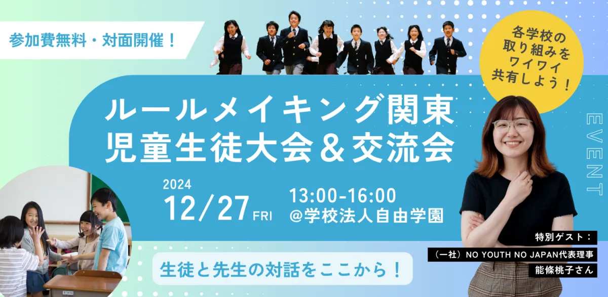2024年12月27日(金)午後、東京の自由学園で「ルールメイキング関東児童生徒大会&交流会2024」が開催されます。このイベントは、児童や生徒が中心となり、自らの意見をもとに学校のルールを見直す試みを行うものです。参加は自由で、一般の方も観覧可能となっています。