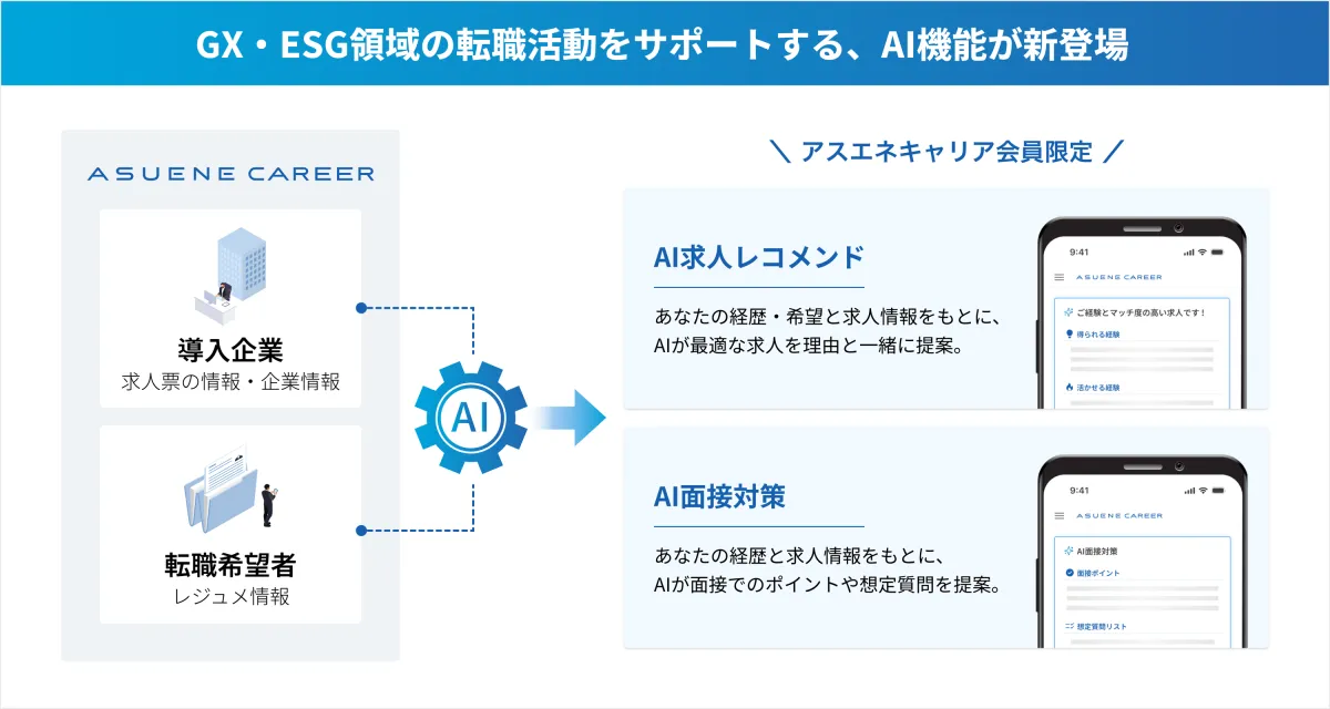 アスエネ株式会社が提供するGX・ESG人材特化型転職プラットフォーム「ASUENE CAREER」は、新たに2つのAI機能を搭載しました。これにより、求職者がGX(グリーントランスフォーメーション)関連の求人に応募する際の壁を低くし、よりスムーズな転職活動を可能にします。この新機能は、AI(人工知能)を駆使して求人情報のマッチングや面接準備をサポートするものです。