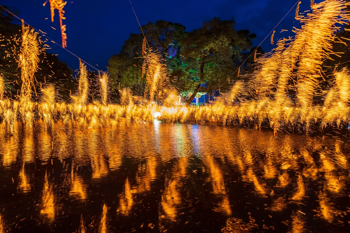 19:10〜20:30:落火ノリの鑑賞。韓国の伝統音楽に合わせて、美しい火の粉の舞いが楽しめます。