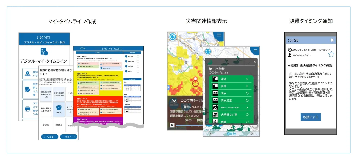 新機能『ニゲドキ』は、個々のユーザーが作成したマイ・タイムラインに基づいて、避難に適したタイミングを通知します。これにより、自宅や勤務先、さらには実家や支援先など、複数の場所において危険な状態を察知できるようになります。ユーザーは、アプリを通じて直感的にタイムラインを作成可能で、これまで特別な知識がなかった方でも簡単に利用できます。