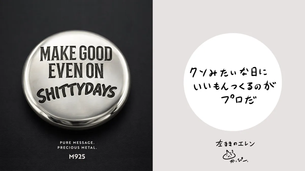 M925は「Pure Message Precious Metal」をテーマに、貴金属に大切な言葉を刻み込んだ商品を展開しています。今回のデザインは、コピーライターでクリエイティブディレクターの中川諒氏と、『左ききのエレン』の原作者であるかっぴー氏が共同で選んだセリフを基にしています。セリフは「クソみたいな日にいいもんつくるのがプロだ」。この言葉の英訳である「MAKE GOOD EVEN ON SHITTY DAYS」をデザインに落とし込みました。