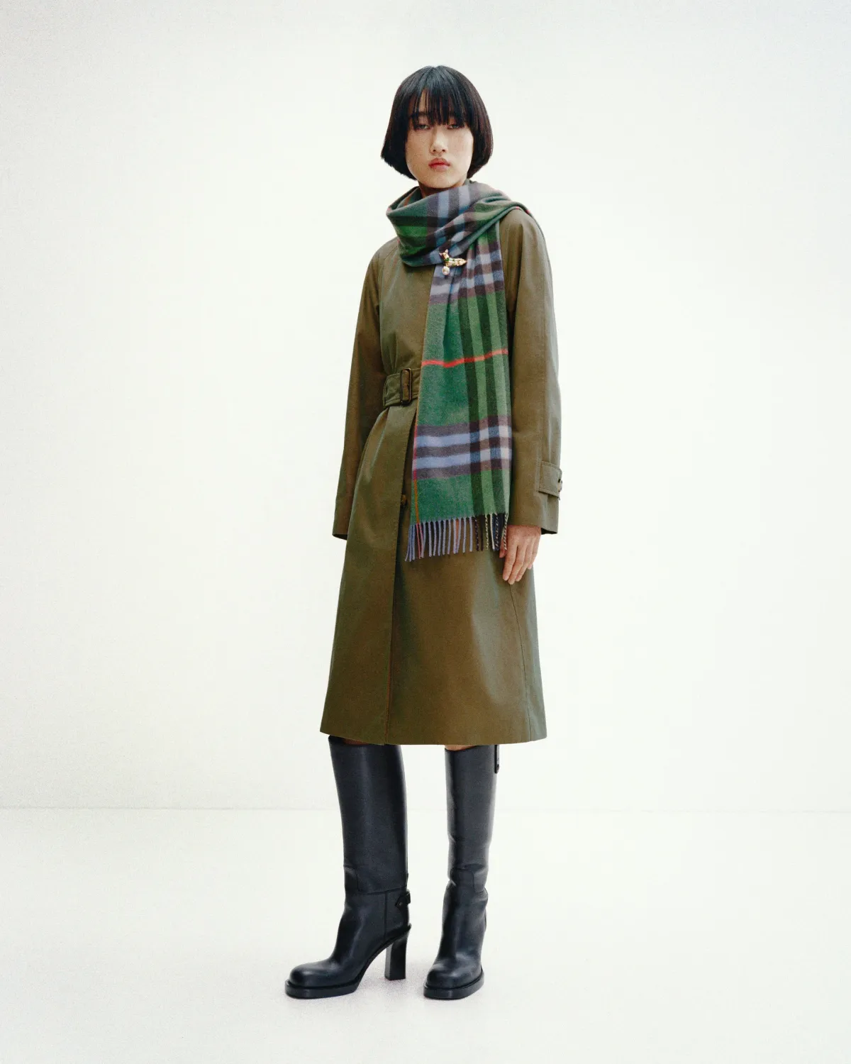 特別にデザインされた新しいカラーの「バーバリー・ハウスチェック」も注目の的です。ホリーグリーンのカラーパレットで表現されたこのチェック柄は、女王が愛用していたタータンからインスパイアを受けたものとして、カーコートのシルクライニングやカシミアスカーフに施されています。