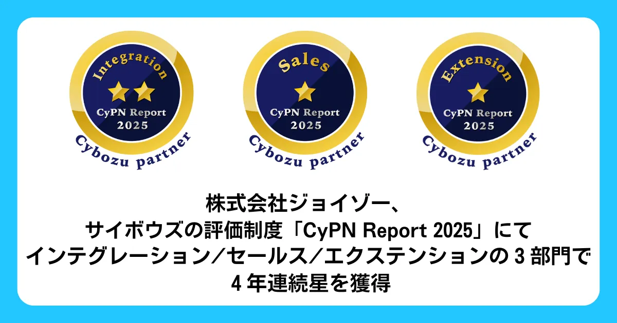 株式会社ジョイゾー(東京都江東区)は、サイボウズ株式会社が展開するオフィシャルパートナー評価制度「Cybozu Partner Network Report 2025」(以下「CyPN Report 2025」)で、インテグレーション、セールス、エクステンションの3つの部門で星を獲得したことを発表しました。この評価は、同社が4年連続で達成したもので、展開しているサービスの質や顧客満足度を反映した結果です。