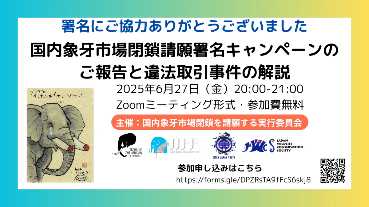 請願署名活動を通じて、象牙取引問題に対する社会的な認識が高まり、様々な団体との連携が深まりました。請願の審議については未だ続いていますが、今回の署名提出は日本の象牙市場閉鎖に向けた大きな一歩です。今後は「国内象牙市場閉鎖を求める実行委員会」として活動を継続し、さらなる署名活動や情報発信を行っていく予定です。オンライン報告会で活動報告を行い、今後の展望を共有する機会も設けています。皆様のご参加をお待ちしています。