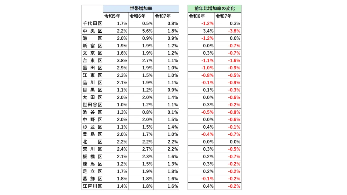 世帯数自体はあいかわらず増加していますが、その速度が鈍化しているのが注目ポイントです。特に令和6年に都心5区においてその傾向が明確で、その後令和7年にはほぼ全ての23区で同様の動きがみられています。これは、住宅価格の上昇が居住選択に影響していることを示唆しています。