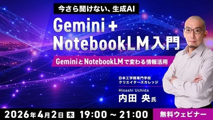 2026年4月2日、株式会社クリーク・アンド・リバー社(C&R社)が主催する無料オンラインセミナー「今さら聞けない、生成AIGeminiとNotebookLMで変わる情報活用Gemini+NotebookLM入門」が開催されます。このセミナーは、業務でのAI活用に興味があるものの、どう始めればいいのかわからない方を対象としています。