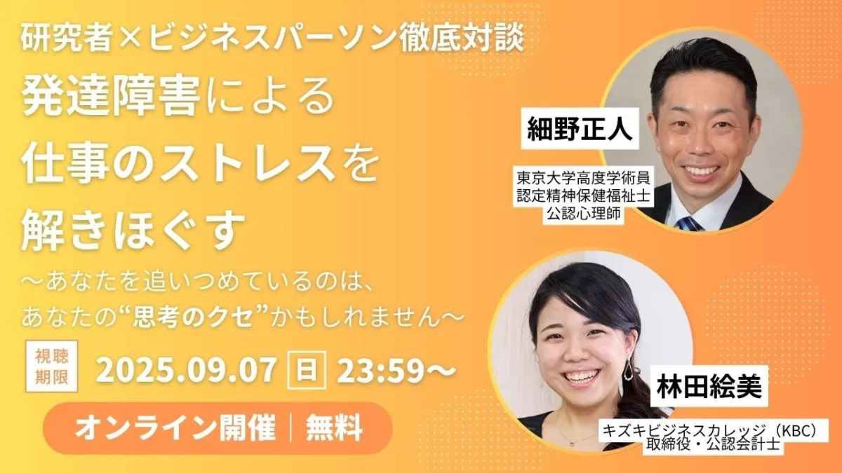 発達障害を抱えるビジネスパーソンにとって、仕事や人間関係に伴うストレスは非常に大きな課題です。そんな中、専門家とビジネスパーソンが対談するオンラインイベントが、発達障害とストレスの関係を深く考える貴重な機会を提供しています。2025年の8月6日、キズキビジネスカレッジ(KBC)が開催したこのイベントは、現在アーカイブ動画として無料で視聴可能です。