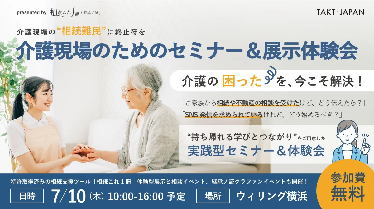 介護業界は日々変化し、さまざまな課題に直面しています。その中でも、相続問題は特に深刻なテーマです。このたび、横浜市に本社を置く株式会社TAKT-JAPANが、2025年7月10日に、介護ロボットとICT機器の展示会と同時開催で「介護現場のためのセミナーと展示会」を開催することが決まりました。これは、介護現場の“相続難民”を救うための新たな試みとして注目されています。
