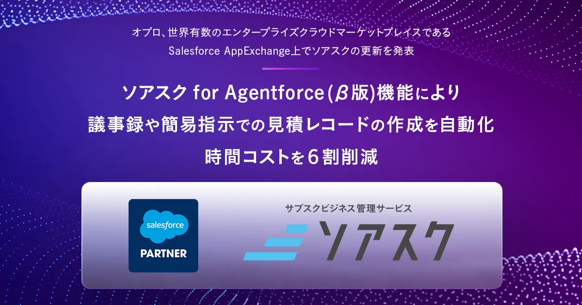 株式会社オプロは2023年10月、Salesforce AppExchangeにおいて「ソアスク for Agentforce(β版)」の更新を発表しました。この新しい機能は、商談における議事録や簡単な指示から見積レコードを自動的に生成できるものです。