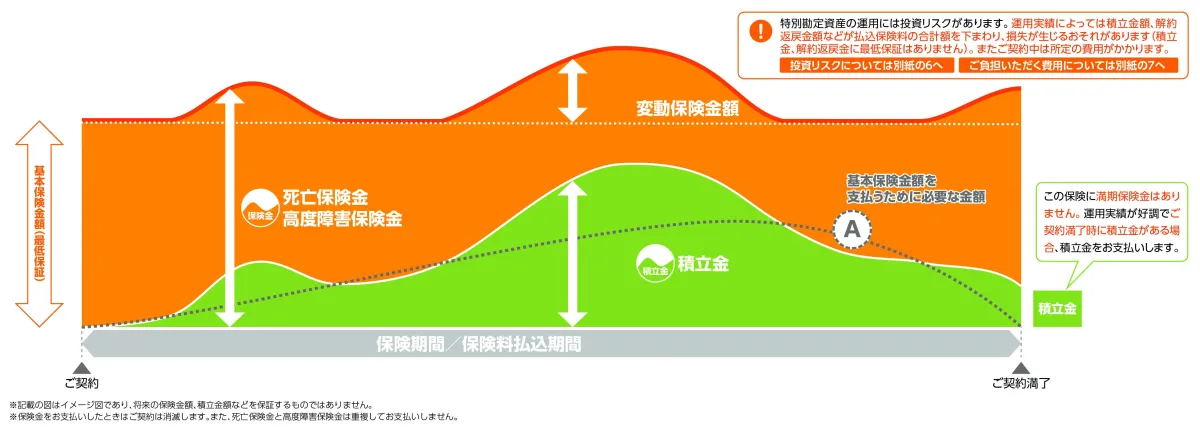 この「変額定期」は、生命保険の一形態で、死亡や高度障害に際して支払われる保険金が、特別勘定の運用実績に応じて変動する仕組みです。具体的には、死亡保険金や解約返戻金が特別勘定の運用状況に影響を受けます。ただし、基本保険金額については最低保証され、安心して契約できる点が嬉しいポイントです。