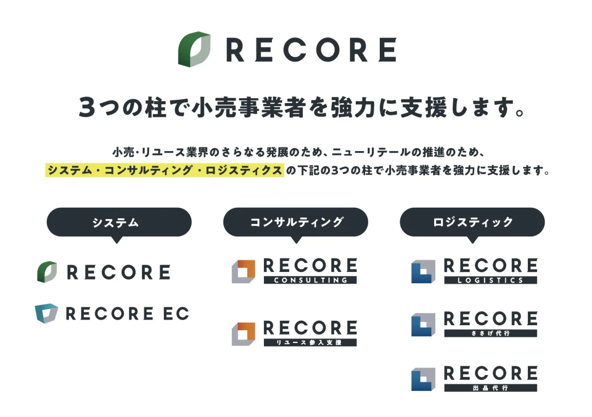RECOREは、2019年にクラウド型基幹システム「RECORE」をリリースして以来、小売・リユース業界のデジタル化に注力してきました。サービスは複数のブランド名で展開していたため、顧客にとって理解しづらい部分もありました。これを受けて、全サービスを「RECORE」のその傘下で展開することにより、顧客にとってよりシンプルで信頼性の高いサービスを提供できるようになるという今回の取り組みです。