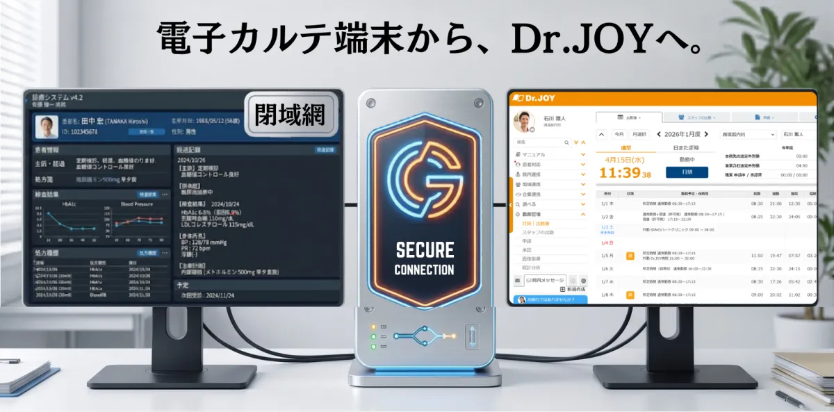 Cloud Gatewayの導入によって、閉じられたネットワーク内から直接Dr.JOYの機能にアクセスできるという新しい選択肢が生まれました。この仕組みを利用することで、複雑な設定を行うことなく、医療機関が持つ電子カルテ端末からシームレスに業務支援が可能になります。具体的には、患者情報を確認しながら勤怠管理を行うことができ、業務の効率化が図れます。