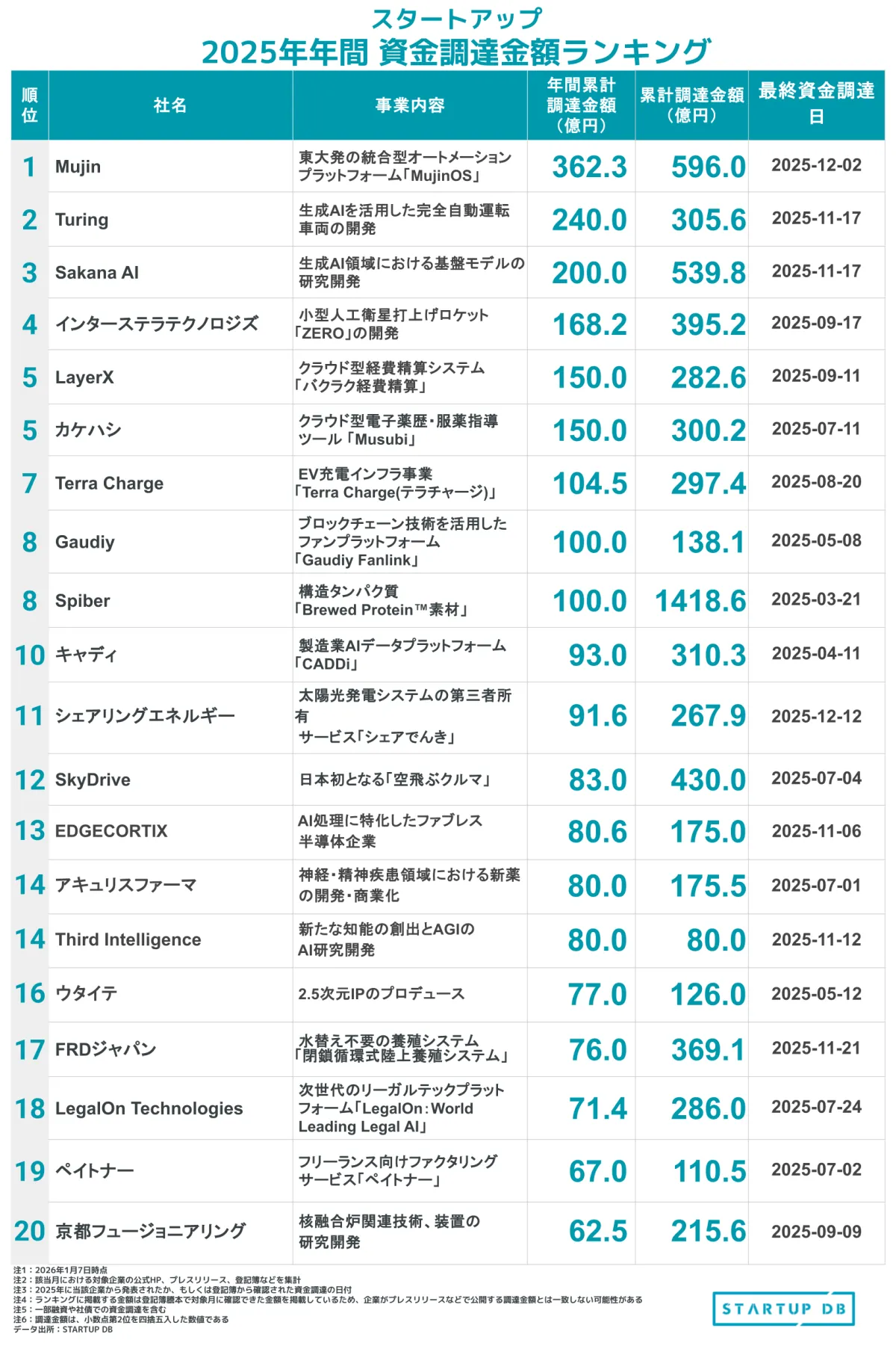 総合オートメーションテクノロジーの企業Mujinが、2025年に362億円の資金を調達し、年間資金調達額ランキングで堂々の1位を獲得しました。Mujinは、独自のフィジカルAIとデジタルツイン技術を活用し、製造・物流現場の自動化を進めることをミッションに掲げ、論理的かつ迅速なシステムの統合を実現しています。
