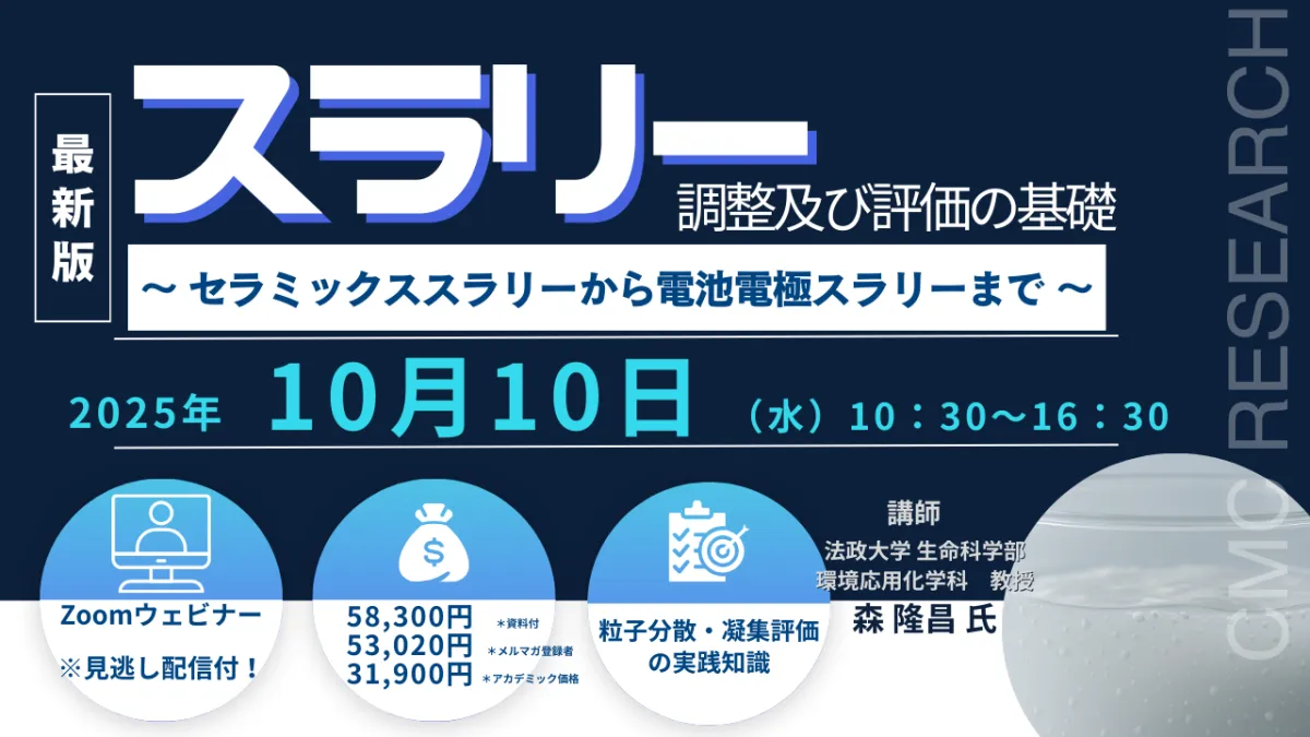 2025年10月10日(金)、株式会社シーエムシー・リサーチが主催するセミナーがオンラインで開催されます。テーマは「スラリー調製及び評価の基礎〜 セラミックススラリーから電池電極スラリーまで〜」で、幅広い産業に関わる貴重な知識が学べる内容となっています。講師には法政大学の森隆昌教授を迎え、粒子分散・凝集状態を支配する因子や評価手法について解説を行います。