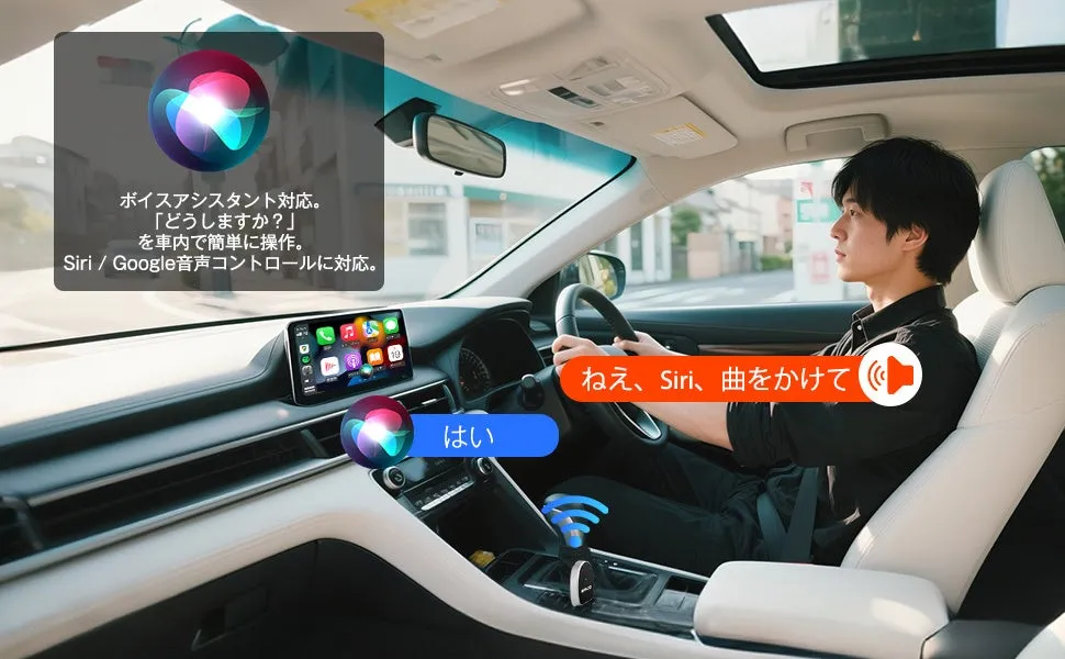 初回の接続はUSBポートに挿入してペアリングするだけ。その後はエンジンを始動するたびに自動的に再接続されるので、毎回の設定は不要。タッチでの操作はもちろん、純正コントローラーやステアリングボタン、音声操作にも対応しており、幅広い車種に合った使い方が可能です。