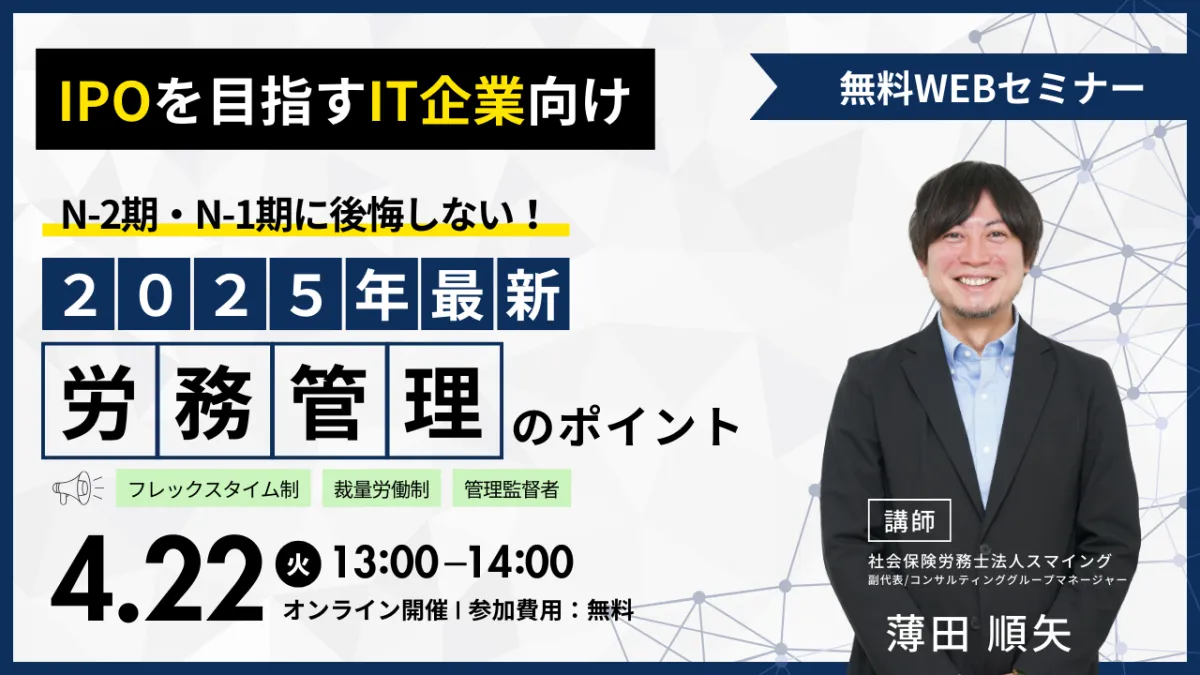 2025年4月22日(火)、社会保険労務士法人スマイングが主催する「【IPOを目指すIT企業向け】N-2期・N-1期に後悔しない!2025年最新労務管理のポイントセミナー」がオンラインで開催されます。このセミナーは、IPO準備における労務管理の重要性を深く理解し、2025年の最新法改正への対応策について学ぶ貴重な機会です。
