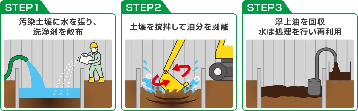 この工法は、洗濯機における衣類の洗浄原理を応用しています。具体的には、まず汚染部分に特殊な洗浄剤と水を注入し、重機で攪拌します。その後、洗浄剤の効果を受けて土壌粒子から油分が剥がれ、水面に浮上します。最後に、油を含んだ水を回収し、新しい水ですすぎます。