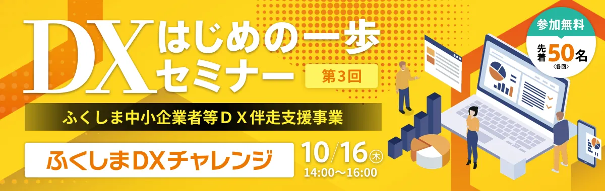 デジタル化に興味がある企業向けの入門セミナーを開催します。成功事例を通じて、具体的な施策を学ぶことができます。開催日時は、令和7年10月16日(木)14:00から16:00、オンラインでの配信です。
