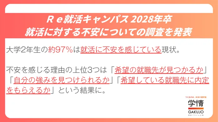 株式会社学情の調査によると、2028年卒業予定の大学生及び大学院生の約97%が就職活動に不安を感じていることが明らかになりました。これは毎年行われているアンケート調査に基づいており、特に大学2年生にとってこれが初めての就職活動となるため、余計に不安を覚えるようです。