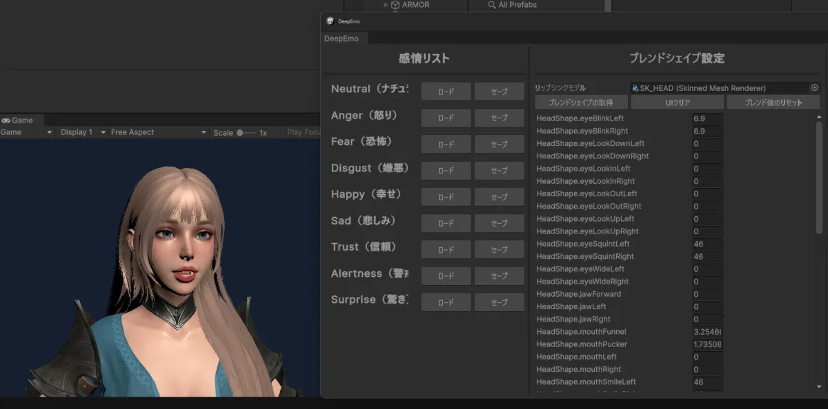 新たに提供されるデモエディタでは、音声データと感情解析結果をCSV形式でインポートするだけで、3Dキャラクターの表情アニメーションを簡単に生成できます。アニメーションは台詞の感情に応じて自然な表現が可能で、リップシンクも含まれています。