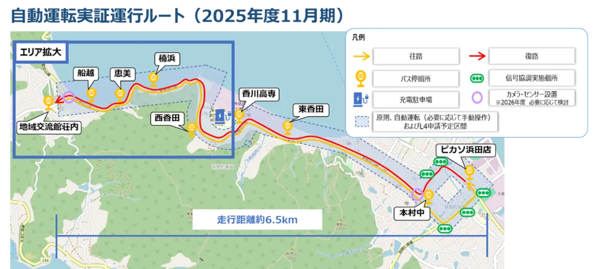 運行は、三豊市の詫間町内を中心に行われ、片道約6.5kmのルートが設定されています。信号協調システムを用いて、交通信号の状況を把握しながら安全に運行する仕組みが導入されているのが特徴です。この新たなシステムによって、自動運転バスは信号を正確に判断し、自動で通過が可能になります。運行エリアの一部は香川高等専門学校詫間キャンパスから地域交流館荘内までの延伸が計画されています。