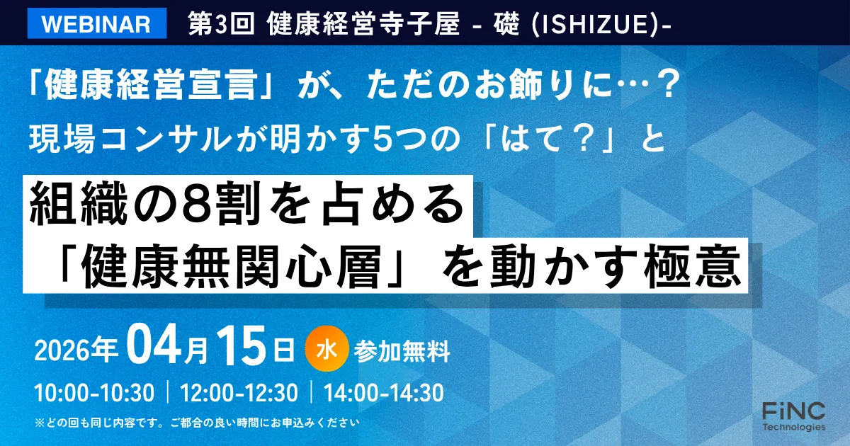 健康経営は企業の根幹を成す重要な要素として、近年多くの企業で取り入れられていますが、その実態は果たしてどうなのでしょうか?2026年4月15日(水)に開催される「健康経営 寺子屋シリーズ第3弾」では、現場のコンサルタントが「健康経営宣言」が形だけになっていないかを問い直し、無関心層を動かすための具体的なノウハウを発信します。