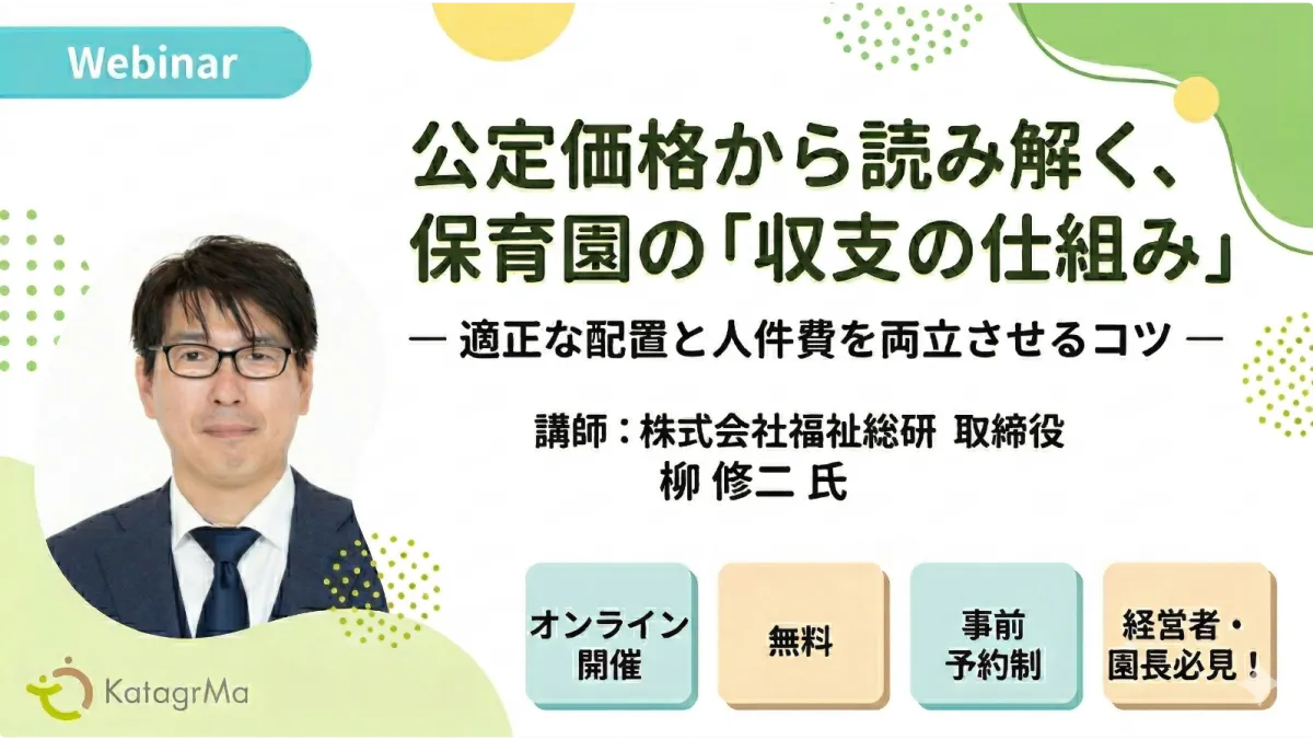 2026年4月21日、株式会社カタグルマは無料のウェビナー「公定価格から読み解く、保育園の『収支の仕組み』 ― 適正な配置と人件費を両立させるコツ ―」を開催します。対象は保育施設の経営層や園長です。このウェビナーでは、保育士や園長としての豊富な経験を持ち、1,400件以上の第三者評価を実施した株式会社福祉総研の柳修二氏が講師を務め、保育園の経営における財務的な視点と今後の制度改正に備えるための具体的な対策を伝授します。
