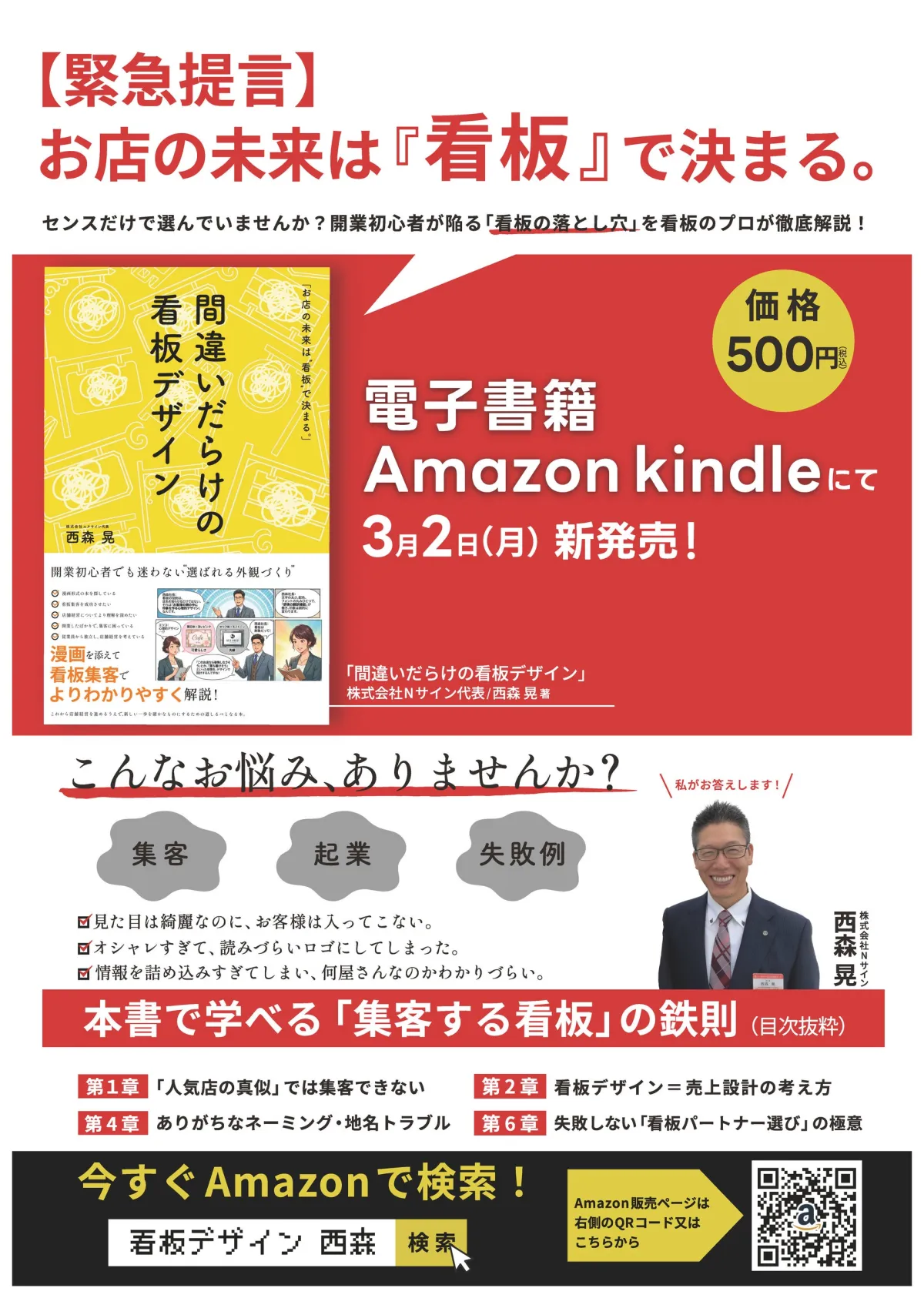 本書『間違いだらけの看板デザイン』の出版日は2026年3月2日、著者は西森晃氏です。価格は500円(税込)で、Amazon Kindleにて販売されます。