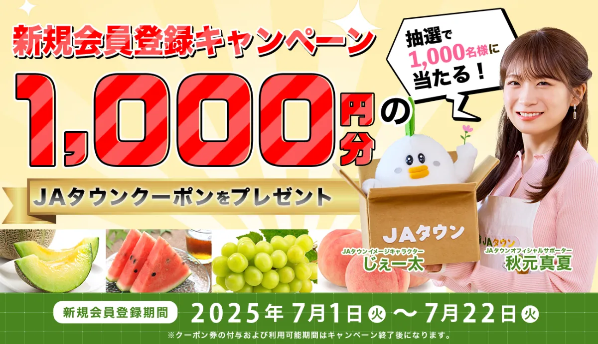 内容: 登録者の中から抽選で1,000名様に1,000円分のJAタウンクーポン券がプレゼントされます。なお、当選者の発表はキャンペーン終了後、厳正な抽選により行われ、当選の連絡をもって通知されます。